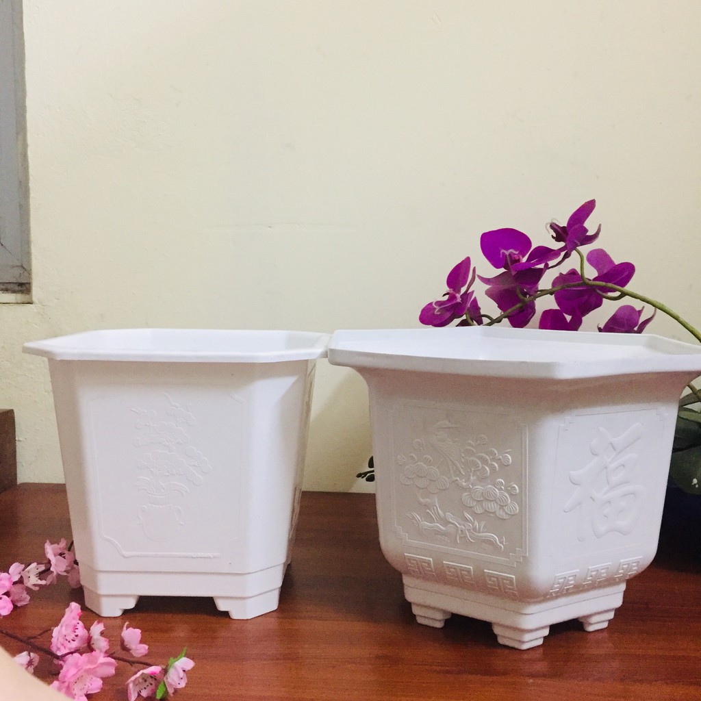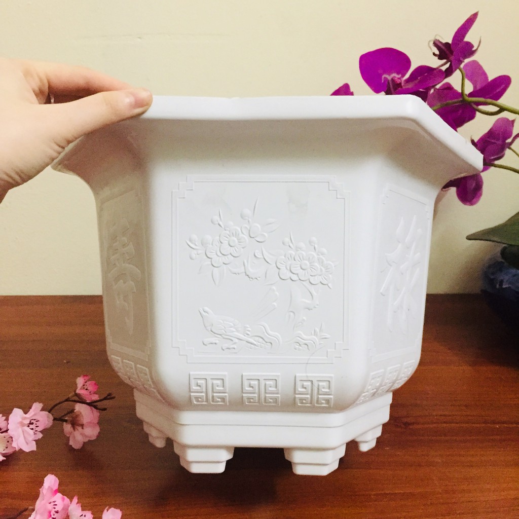 Nhà cửa & Đời sống > Làm vườn > Chậu cây || chậu trồng cây bằng nhựa cứng màu trắng, dày dặn, chịu được thời tiết, có in hoa văn đẹp mắt, trồng cây cảnh, cây hoaCòn hàng