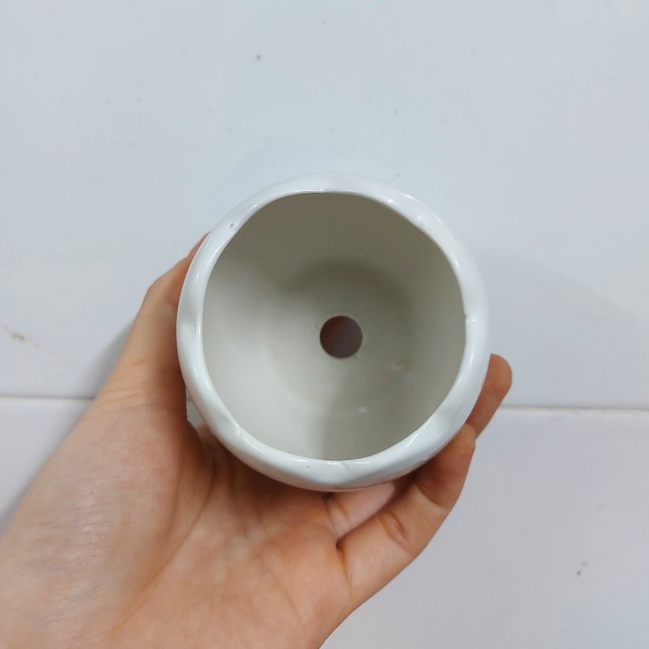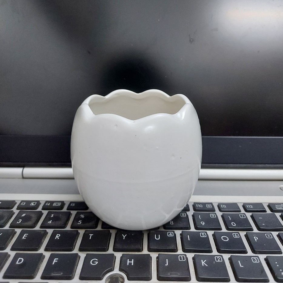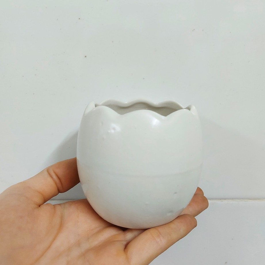 Tên chậu: vỏ trứngKích thước: đường kính miệng 6.5cm, đường kính to nhất 8cm, cao7cm
