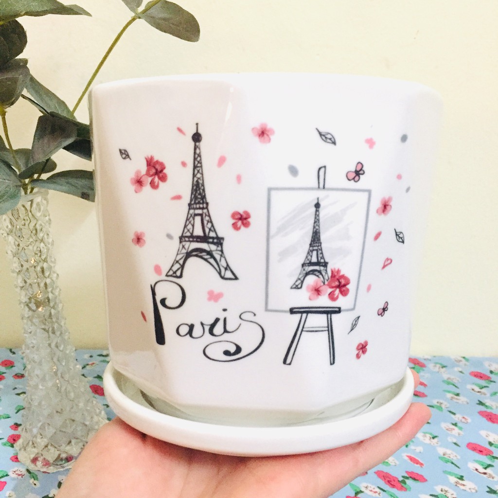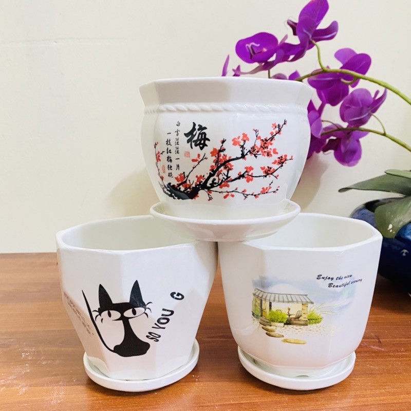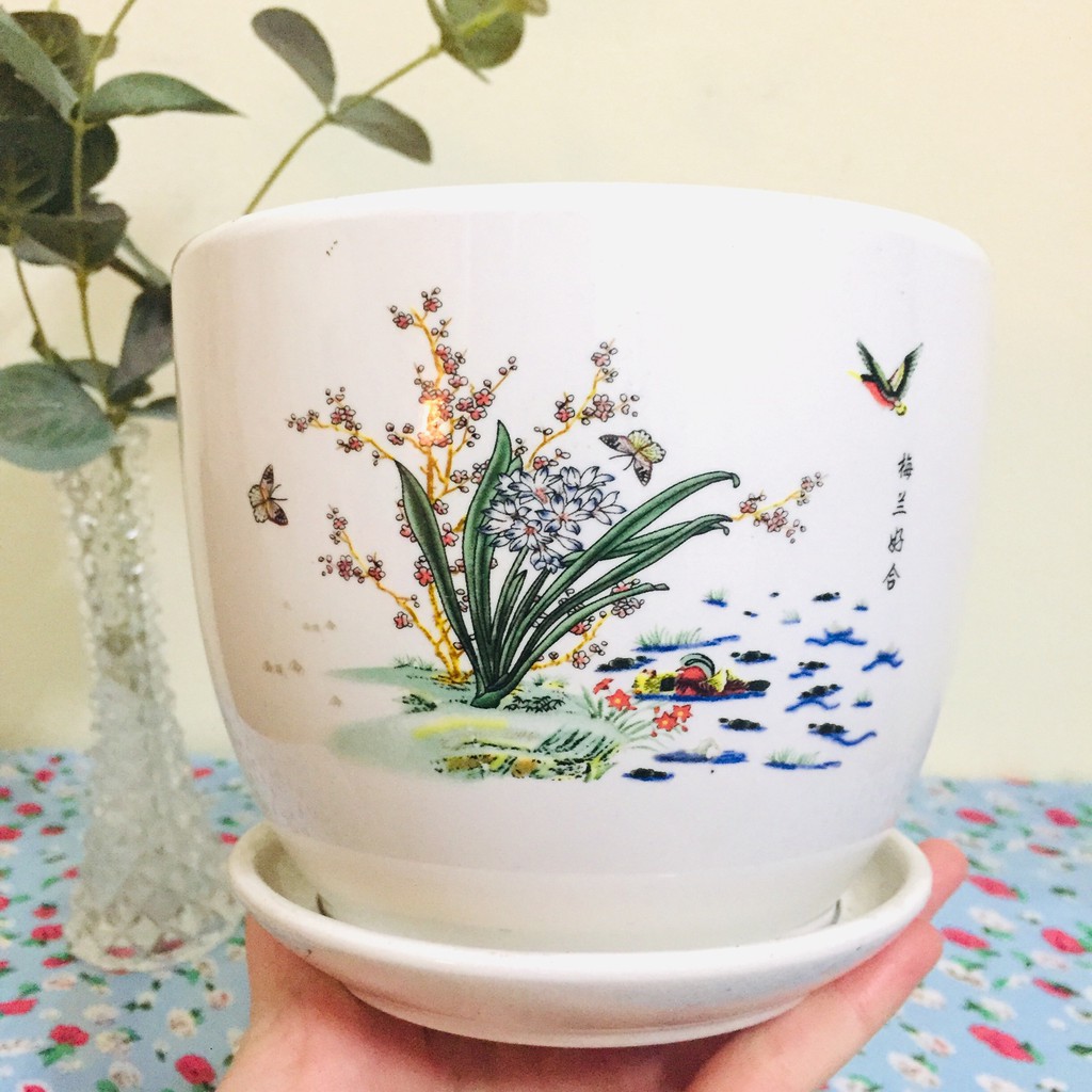 Nhà cửa & Đời sống > Làm vườn > Chậu cây || Chậu trồng cây để bàn bằng gốm sứ Bát Tràng, họa tiết dễ thương, sứ men trắng tráng bóng,có đĩa lót, rộng 18cm, cao 17cmCòn hàng