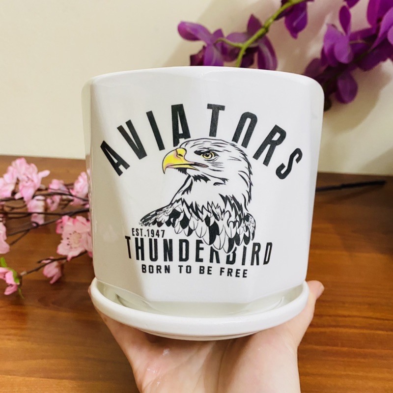 Chậu trồng cây để bàn bằng gốm sứ Bát Tràng, họa tiết dễ thương, sứ men trắng tráng bóng,có đĩa lót, rộng 18cm, cao 17cm