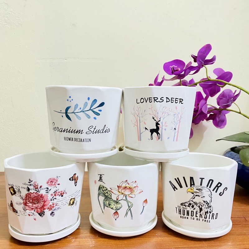 Chậu trồng cây được làm bằng chất liệu sứ tráng men trắng bóng, hình dạng, họa tiết đa dạng, dễ thương, hợp mắt.