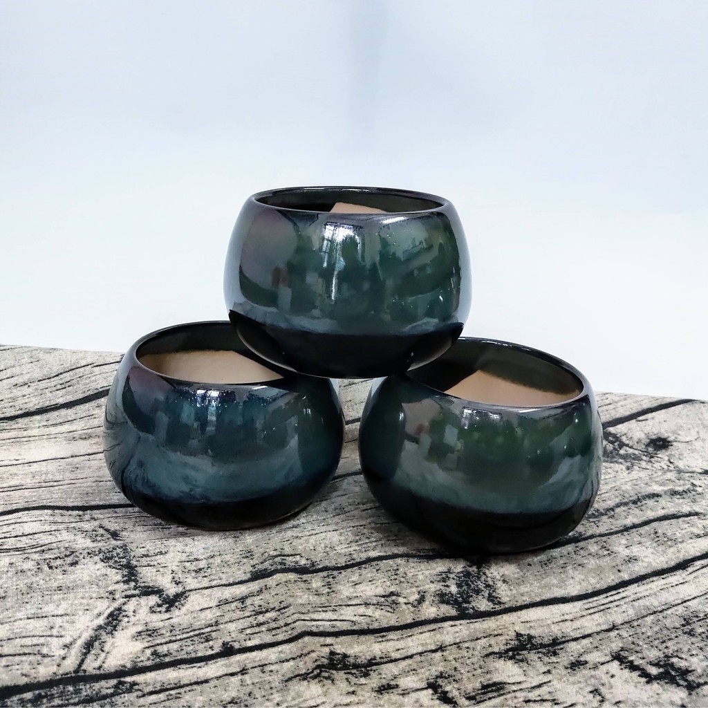 Chậu trồng cây men xanh đậm hỏa biến hình hạt dẻ S2, có đĩa hứng nước, trồng cây để bàn, cây phong thủy siêu đẹp và sang