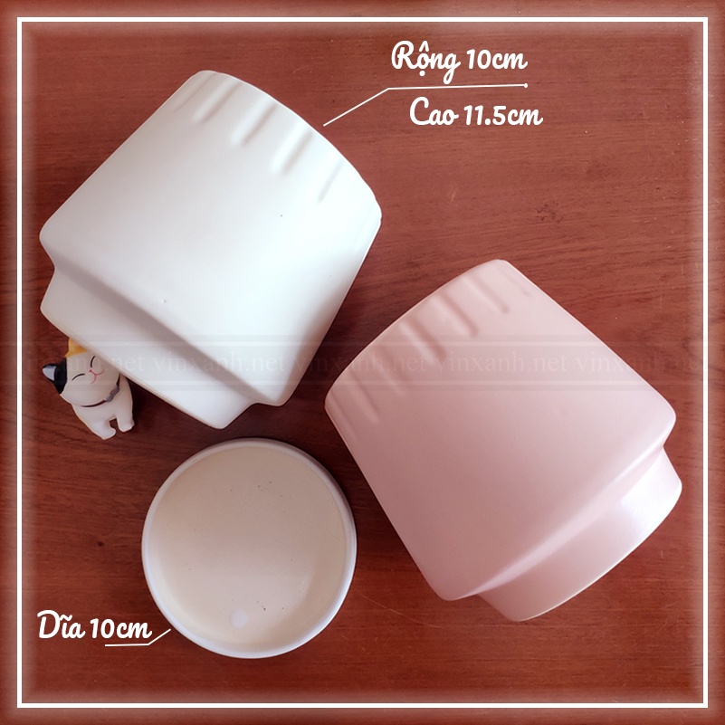 ✔️ Kích thước: Đường kính miệng: 10 cm; Chiều cao: 11.5 cm => chậu phù hợp với dĩa lót 10cm