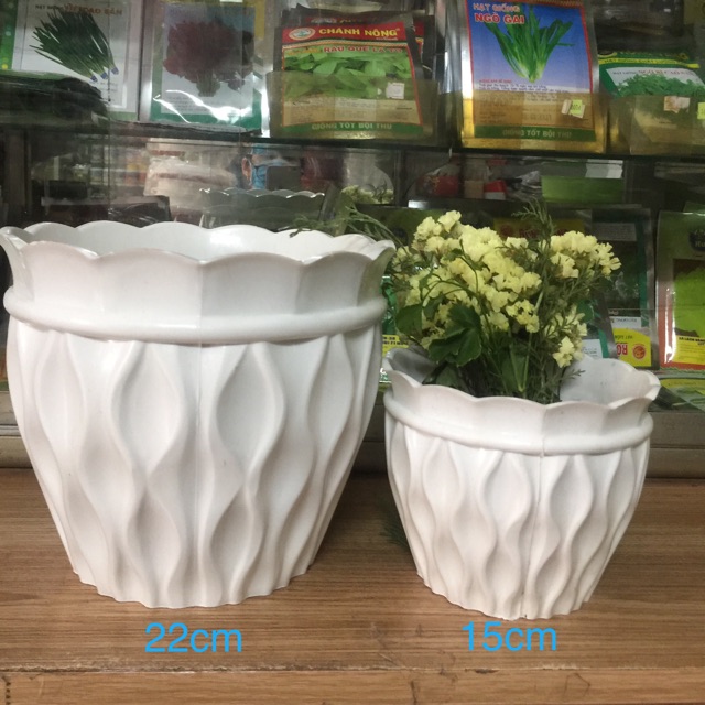Chậu không kèm hoa.Sản phẩm nhựa dầy dặn, cứng cáp.