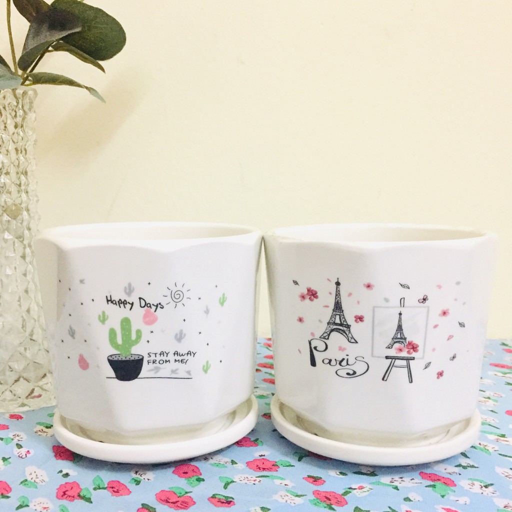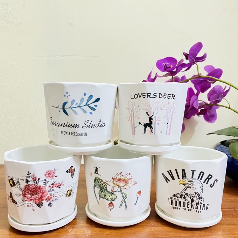 Chậu trồng cây được làm bằng chất liệu sứ tráng men trắng bóng, hình dạng, họa tiết đa dạng, dễ thương, hợp mắt.