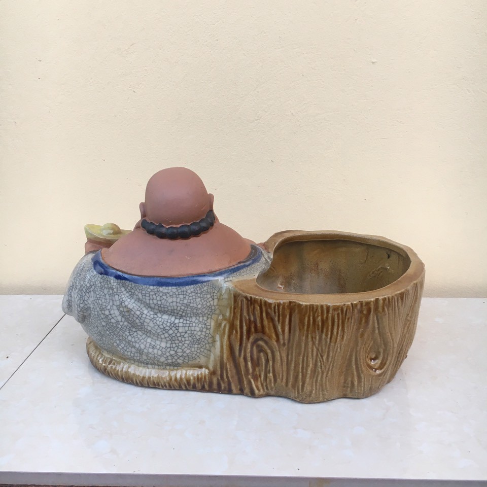 Chậu tượng Di lạc cầm thỏi vàng men rạn và men xanh ngọc gốm Bát tràng 1 size CT-32