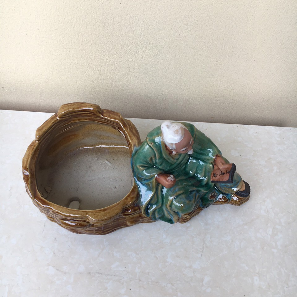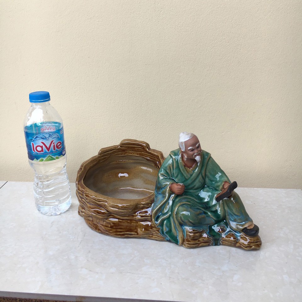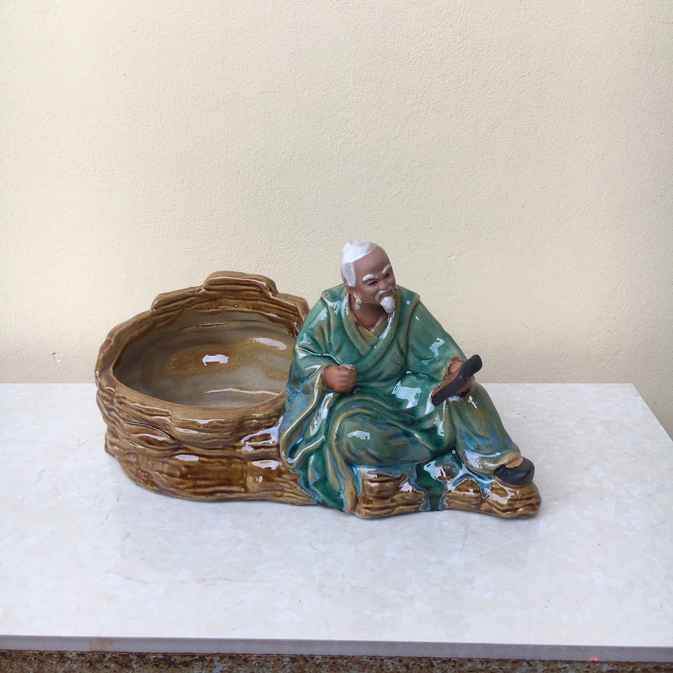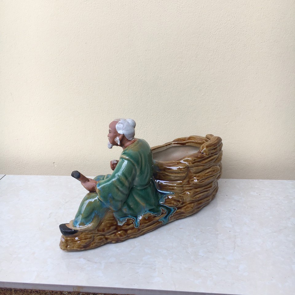Chậu tượng Ông lão đọc sách men màu xanh ngọc gốm Bát tràng 1 size CT-12