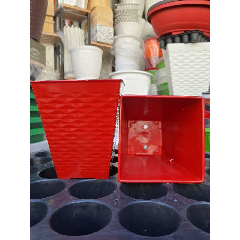 chậu nhựa vuông, hoa văn là những gợn sóng lăn lăn mềm mại, nhẹ nhàng.chậu có đường kính vuông 13cm, cao 15cm. chất nhựa nguyên sinh rất bền chắc. Bề mặt chậu sáng bóng rất dễ vệ sinh.