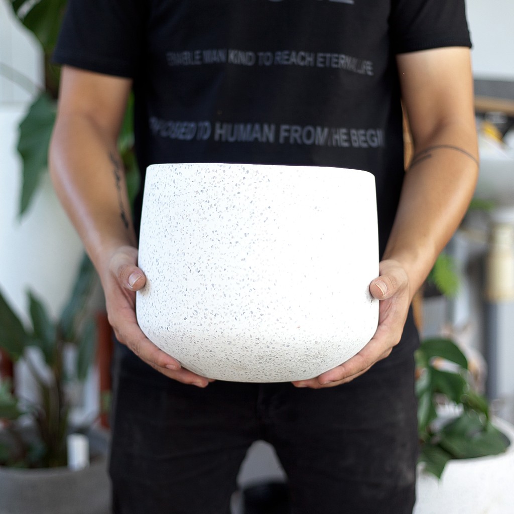 Màu trắng/Xi măng được chấm phá bằng những viên đá nhỏ được mài nhẵn trông rất độc đáo, lạ mắt phù hợp với mọi loại cây và không gian trang trí.