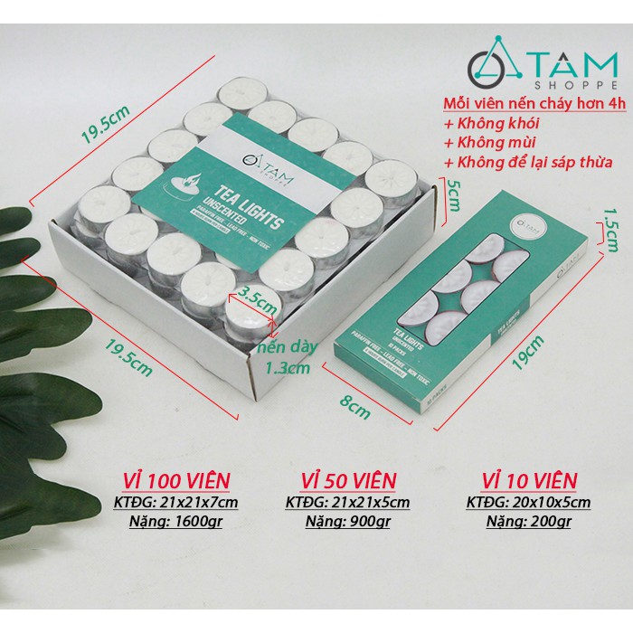 Nến Tealight được đóng gói theo số lượng hộp 10 viên, 50 viên, 100 viên. Thích hợp cho từng nhu cầu sử dụng linh hoạt.