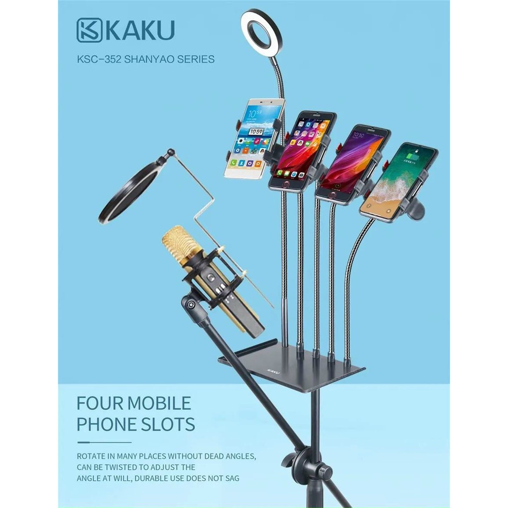 Giới thiệu [ Bán chạy ] Giá đỡ livestream KAKU 4 kẹp điện thoại , 1 kẹp micro, 1 đèn led