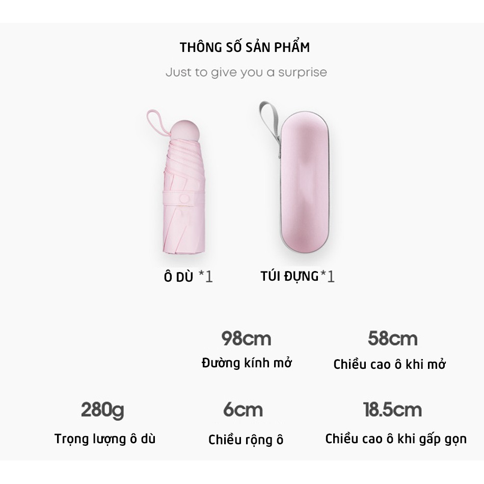 Ô DÙ CHE NẮNG MƯA MINI GẤP GỌN HÌNH VIÊN THUỐC SIÊU XINH - MẪU MỚIÔ Dù Che Nắng Mưa Mini Gấp Gọn Hình Viên Thuốc Siêu Xinh - Mẫu Mới thiết kế nhỏ gọn, tiện dụng nhưng lại rất thanh lịch và độc đáo. Với thiết kế 2 lớp từ vải cao cấp giúp tăng cường khả năng chống nắng lên đến 99%, giúp bảo vệ làn da của bạn cực tốt. Sản phẩm vô cùng nhỏ gọn, không chiếm nhiều diện tích nên có thể mang theo bên mình rất tiện lợi.