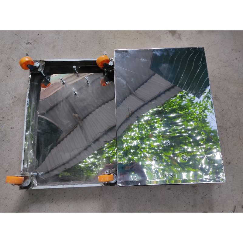 + vỏ đế bằng tôn bọc bên ngoài có sơn chống rỉ, nếu đổ bê tông bên trong nặng khoảng 60kg, có 4 bánh xe tiện lợi