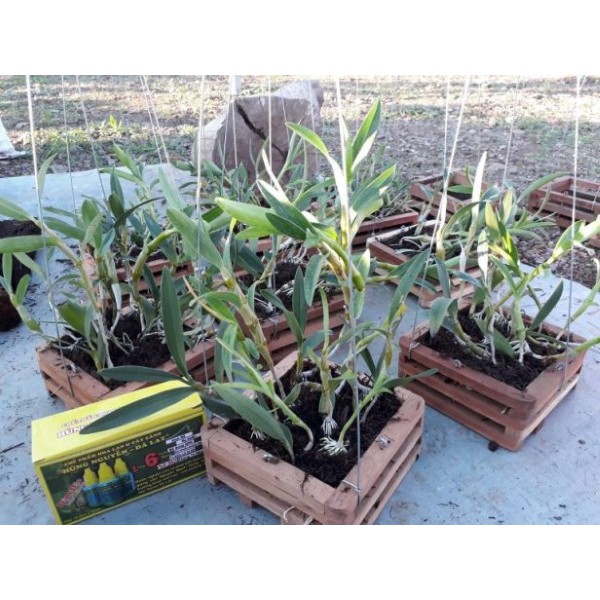- Đối với lan mới khai thác: Cắt bỏ rễ hỏng, lá dập, vòi hoa cũ, làm sạch bộ rễ, ngâm vào nước đã pha chế phẩm theo tỷ lệ 1ml/1 lít nước khoảng 2 tiếng. Sau đó treo ngược 10-15 ngày hoặc có thể ghép ngay vào giá thể. Quy trình tiếp theo giống như phần tách ở trên. Cây mới khai thác kể cả dòng thân đốt thời gian này vẫn bắn rễ rất nhanh, cây phục hồi phát triển tốt.