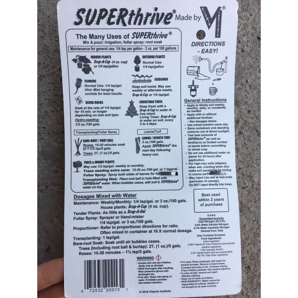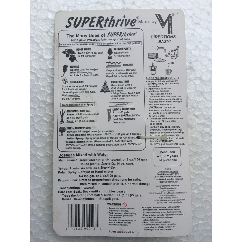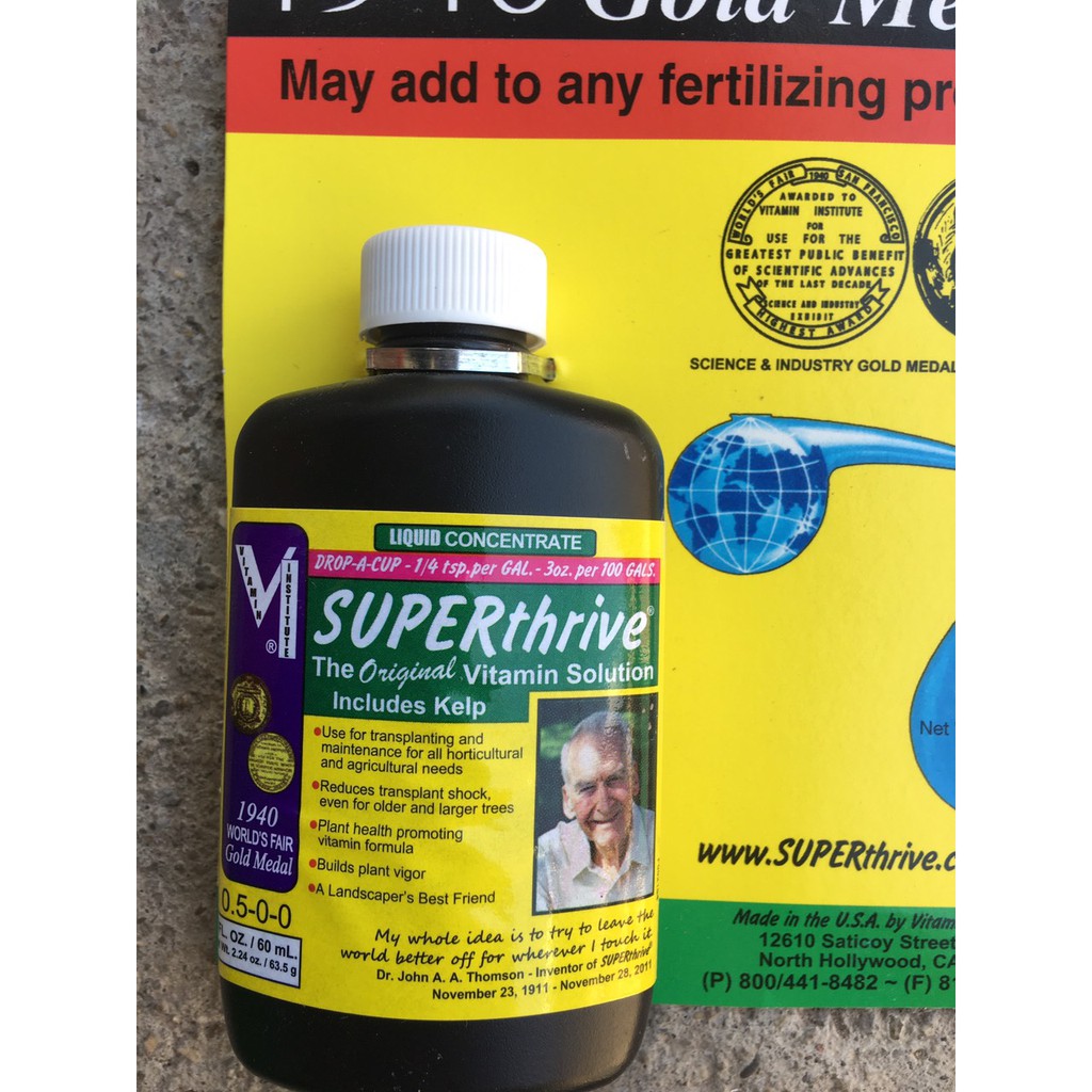 SUPERthrive được phòng thí nghiệm thử nghiệm của Mỹ (WARF) xác nhận chất lỏng không độc hại – chủ yếu sản phẩm tăng cường sự tăng trưởng cho các thực vật, – được sản xuất từ năm 1940. Nó chứa 0,09% vitamin B1, 0,048% 1-Napthyl acetic acid.