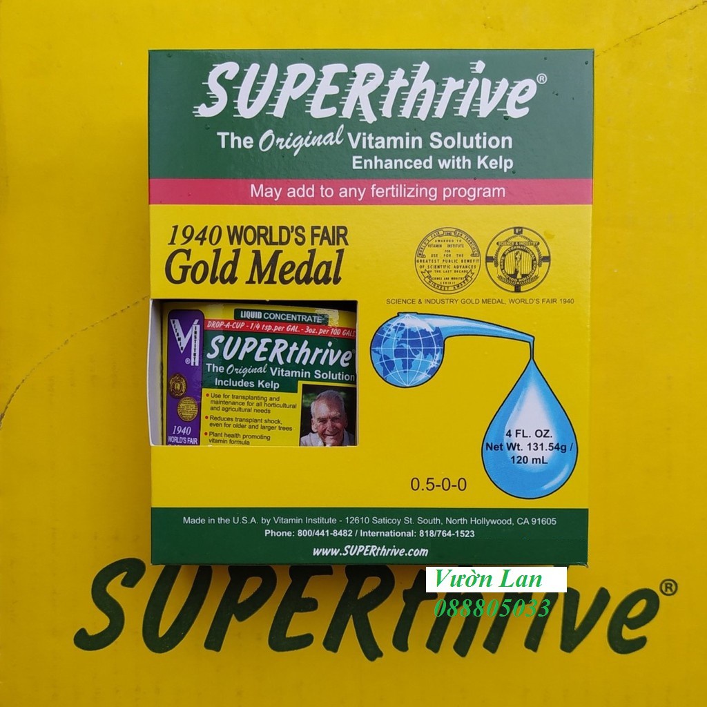 - SuperThrive có thành phần là các chất vitamins và các hormon thực vật kích thích tăng trưởng cho cây trồng, bổ sung 50 hormon làm phá vỡ sự chậm phát triển của cây. Làm cây mau ra rễ, chồi, hoa,… Cực tốt cho lan.