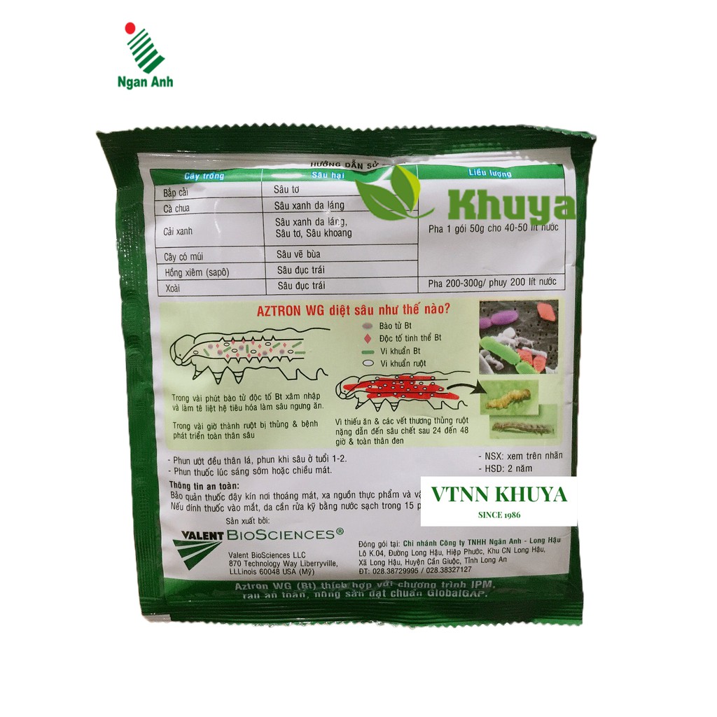 * Công dụng: Aztron WG là loại sinh học thế hệ mới nhất, với hàm lượng 35 tỷ vi khuẩn Bt chứa các bào tử và tinh thể độc tố, dùng đặc trị s tơ, s xanh da láng, s đục trái, s khoang,...là các loại s có tính kháng cực mạnh và đã kháng th hóa học