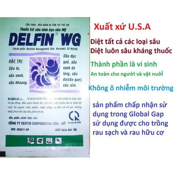Giới thiệu sản phẩm Thuốc trừ sâu vi khuẩn Delfin WG 10g an toàn cho gia đình trồng rau sạch (thành phấn vi sinh Bacillus thuringiensis) USAThuốc trừ sâu sinh học Delfin củ Mỹ là một thành tựu lớn của nông nghiệp thế kỉ 21. Defin có thành phần hoàn toàn là vi sinh vật có khả năng gây độc cho sâu. Chủng vi sinh là Bacillus thuringeinsis – có khả năng tiết nội độc tố khi được sâu nuốt vào bụng.