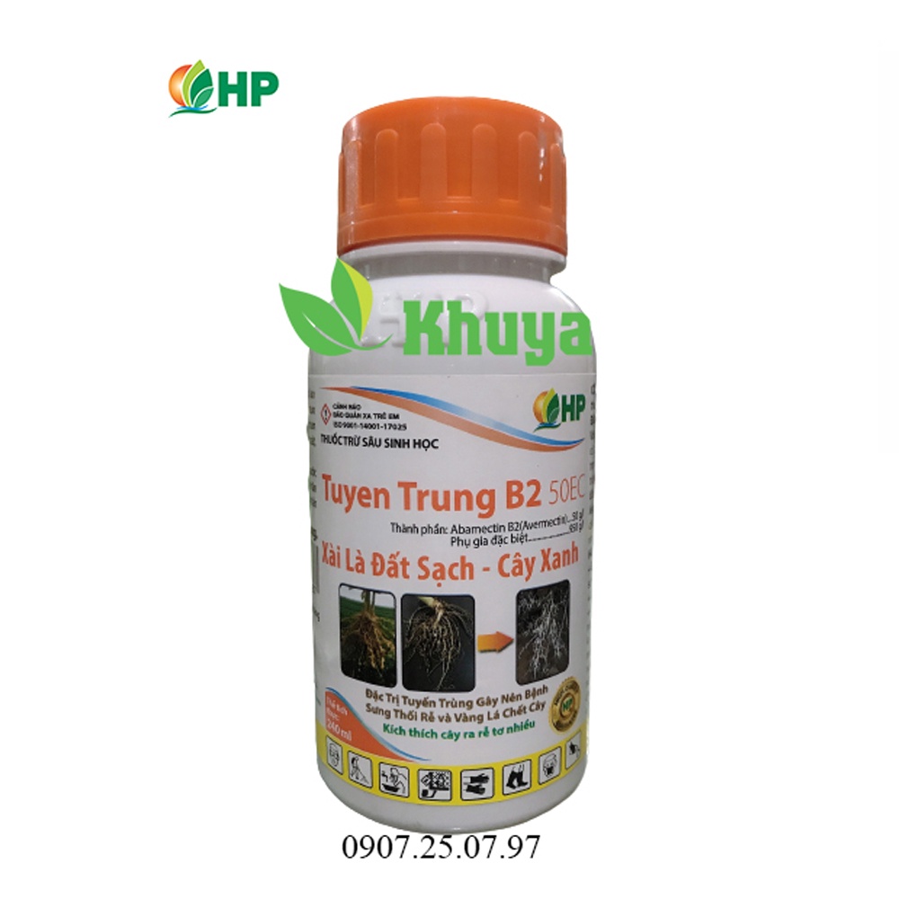 CÔNG DỤNG: Thuốc Tuyen Trung B2 50EC là thuốc đặc trừ tuyến trùng sinh học được bảo hộ ĐỘC QUYỀN ĐĂNG KÝ DUY NHẤT tại Việt Nam. Với công nghệ phối trộn tiên tiến hiện đại thuốc có tính loang trải và thẩm thấu nhanh vào bên trong đất, trong rễ cây giúp diệt ngay tức thì tuyến trùng từ trong trứng. Thuốc có tính kết dính trong đất cao và tan từ từ nên hiệu lực diệt tuyến trùng kéo dài. Khi phun hoặc tưới Tuyen Trung B2 50EC cây phục hồi nhanh, kích thích cây ra rễ tơ mới nhiều hơn.