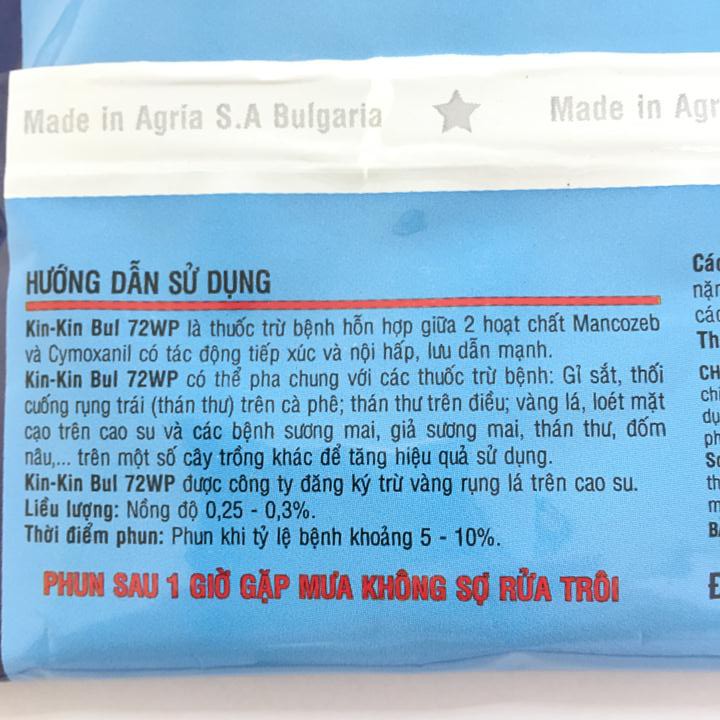 Chế phẩm trừ nấm bệnh cây trồng, đặc hiệu chống thối nhũn phong lan KIN KIN BUL 72WP gói 100g nhập khẩu Bulgari.KIN KIN BUL 72WP gói 100g là chế phẩm trừ bệnh hỗn hợp giữa 2 hoạt chất Macozeb và Cymoxanil có tác động tiếp xúc nội hấp và lưu dẫn mạnh.