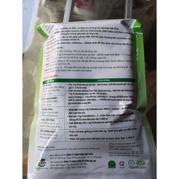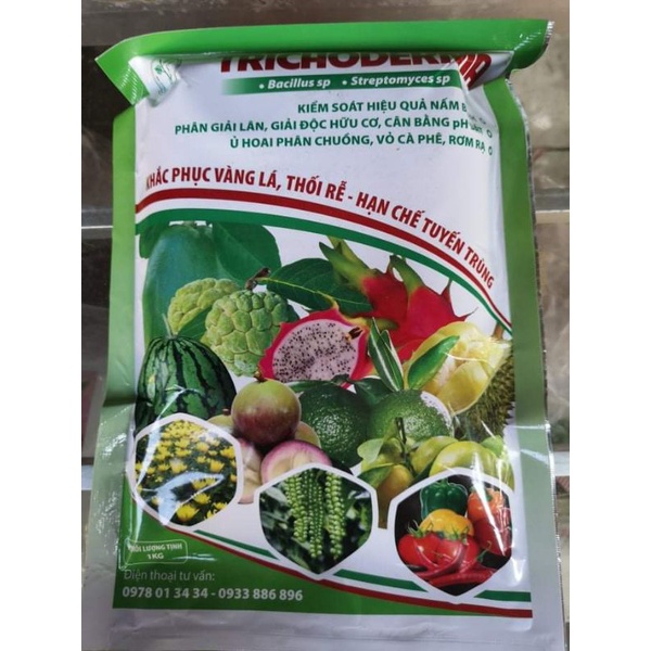 Thông tin sản phẩm Chế phẩm Trichoderma hay còn có tên khoa học là HP2 Sản phẩm dạng bao nhỏ, khối lượng tịnh: 1kg Thành phần: Vi nấm Trichoderma Xạ khuẩn Streptomyces sp Vi khuẩn Bacillus sp N, K2O, P2O, MgO, CuSO4, NAA, B2O, Zn, Mn, … cùng nhiều chất khác. Công dụng của Chế phẩm sinh học Trichoderma 500g Chế phẩm Trichoderma 500g là sản phẩm sinh học rất quan trọng trong quá trình cải tạo ruộng, vườn. Sản phẩm được dùng để ủ phân, rắc, tưới để cải tạo đất. Sản phẩm có nhiều công dụng nổi bật: Cung cấp các vi sinh vật có lợi để cải tạo đất. Tái tạo mùn khiến cho đất tơi xốp. Hỗ trợ thúc đẩy sự phát triển rễ giúp cây phát triển tốt và tăng năng suất mùa vụ. Kháng nấm giúp cây phát triển tốt mà không bị nấm phá hại hoặc giảm năng suất. Giải độc hữu cơ và phân giải Lân bị tích tụ trong đất. Phân hủy nhanh xác động vật, phân giúp chuồng nuôi, ruộng vườn không hôi thối, hỗ trợ phân hủy các chất dinh dưỡng có trong phân. Chống các loại bệnh thường gặp ở cây như vàng lá, thối rễ, hạn chế tuyến trùng ... Phân giải tốt các chất xơ, chitin, lignin, pectin thành các đơn chất giàu dinh dưỡng giúp việc hấp thụ của cây dễ dàng hơn. Cùng nhiều tác dụng có lợi cho cây khác khiến chế phẩm trở thành sản phẩm không thể thiếu của mọi nhà nôngGiá XION