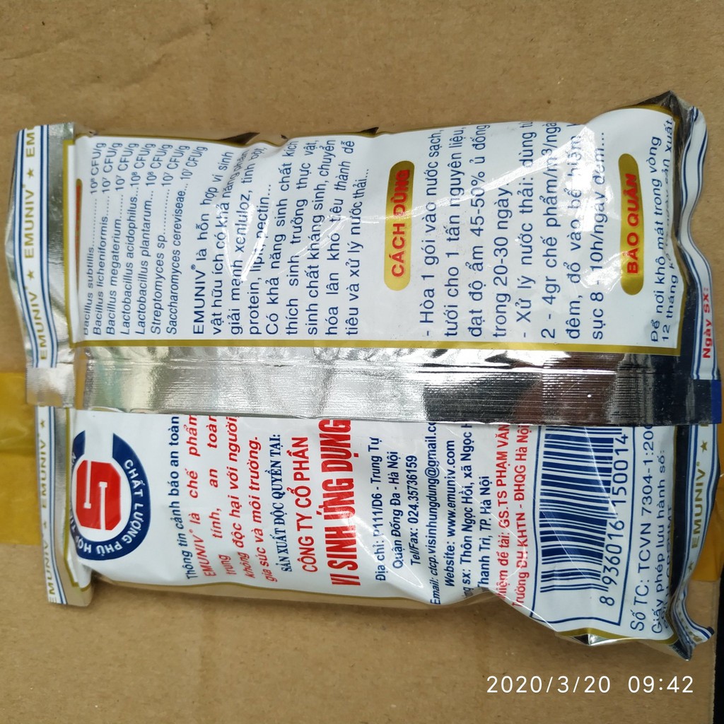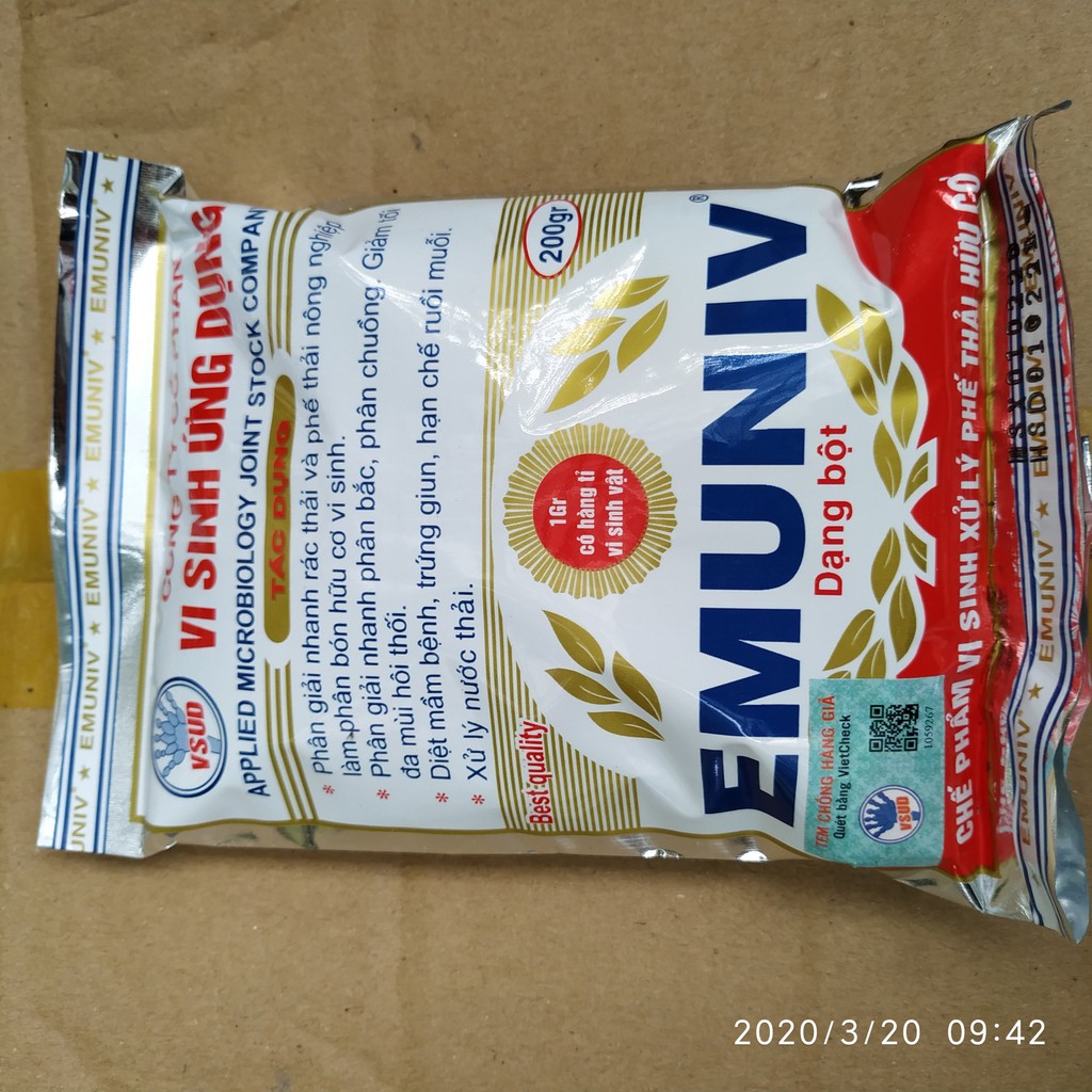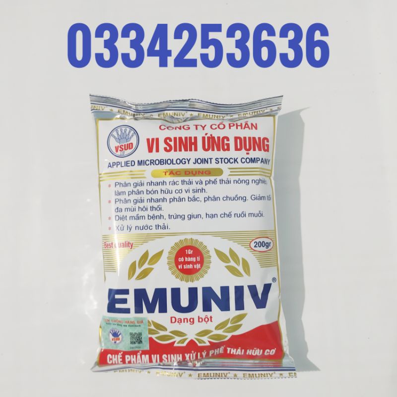 Chế Phẩm Vi Sinh Xử Lý Phế Thải Hữu Cơ EMUNIV Gói 200GChế phẩm EM có thể sử dụng với nhiều mục đích khác nhau, như xử lí rác thải Thành phố, phế thải sau thu hoạch, phân gia súc, gia cầm để làm phân bón hữu cơ.