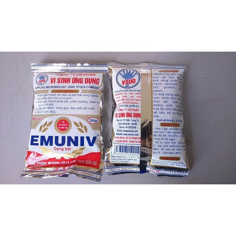 Chế phẩm vi sinh xử lý phế thải hữu cơ EMUNIV gói 200gChế phẩm sinh học Em (Emuniv ) là chế phẩm vi sinh EM xử lý phân gia súc gia cầm, rác thải, phế thải nông nghiệp làm phân bón hữu cơ và xử lý ô nhiễm môi trường.