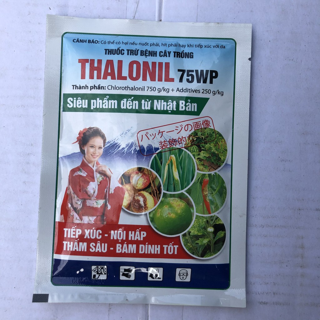 Công dụng: Thuốc trừ nấm bệnh Thalonil 750WP phòng trừ nhiều loại bệnh trên nhiều loại cây trồng khác nhau, không để lại vết thuốc trên lá, quả. Thalonil 750WP có tác dụng trừ bệnh cao và kéo dài; thuốc có chất bám dính tốt, sau khi phun gặp mưa ít bị rửa trôi.