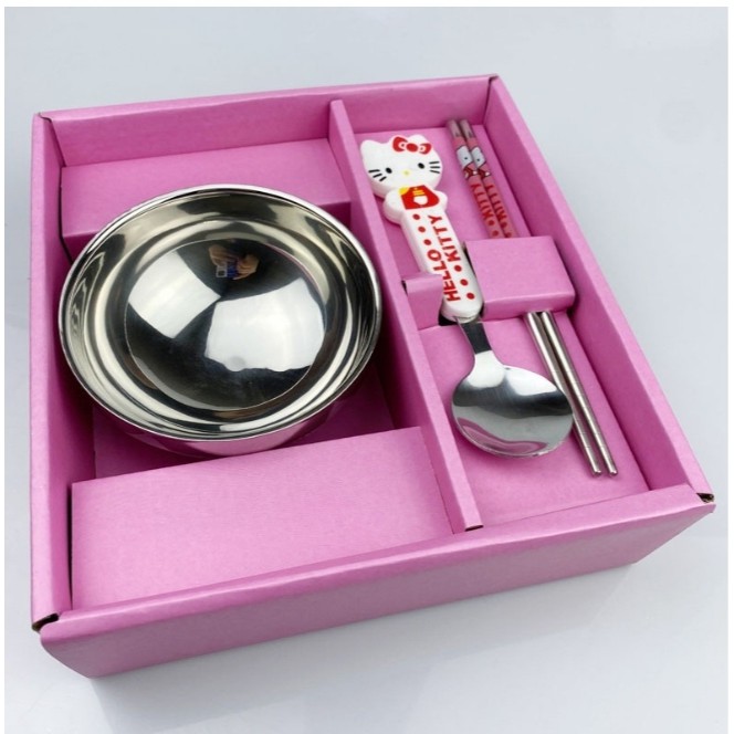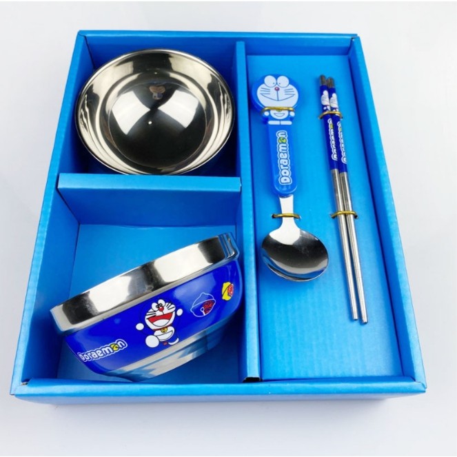 - Bộ bát, đũa, thìa hình Hello Kitty và Doremon ngộ nghĩnh, dễ thương kích thích bé ăn nhiều và ăn ngon miệng hơn.