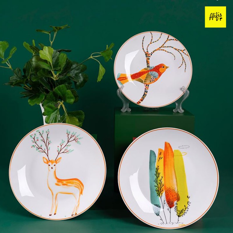 - Bộ bát đĩa họa tiết Hươu vàng được làm từ chất liệu gốm sứ cao cấp, bền, sáng, đẹp màu men sáng bóng, không chì, không độc hại