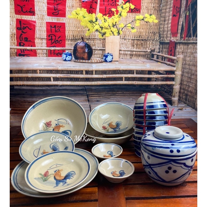 Bộ chén bát kiểu xưa gốm sứ Nam bộ họa tiết con gà trống