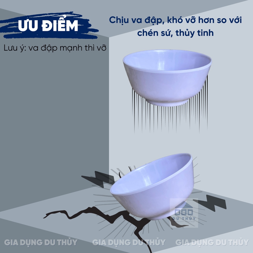 - Chất liệu Melamine an toàn cho sức khoẻ, dễ vệ sinh, hạn chế nứt vỡ, tuy nhiên sản phẩm không dùng được trong lò vi sóng