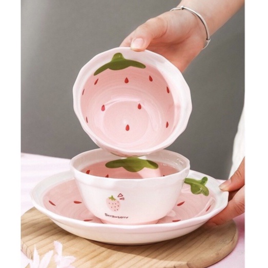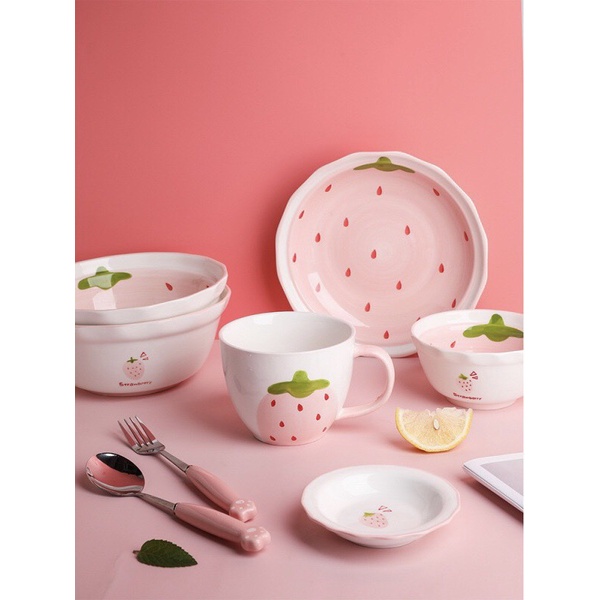 Tên sản phẩm : Chén Dĩa Dễ Thương Đĩa Sứ Set Bát Đĩa Decor Bát Ăn Cơm Chén 🍓Sứ Dâu Hồng 🍓Siêu Đẹp S153- Chất liệu: GỐM SỨ cao cấp