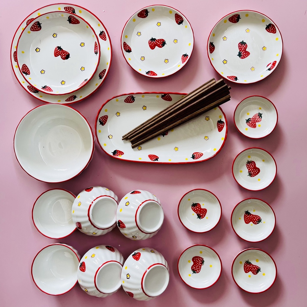 Bộ Chén Dĩa SứTẶNG GÁC ĐŨABát Ăn Cơm Đĩa Sứ Dễ Thương Cute Bát Đĩa Dâu tây Decor Cao Cấp(set 18 sản phẩm tặng kèm 6 đô