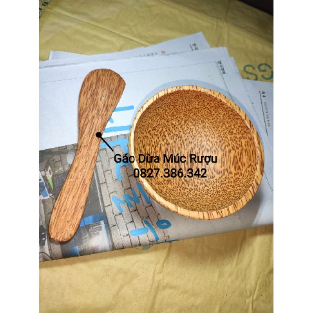 Chén gỗ dừa kích thước 12cm, cao 5.5cm.Que trộn bột gỗ dừa kích thước dài 18cm, bản rộng 4.2cm.