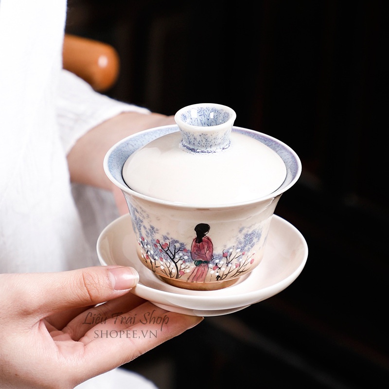 Giới thiệu Chén khải tiềm trà men Nhữ Diêu ly pha trà có nắp ly trà tàu hoa văn vẽ tay 130ml