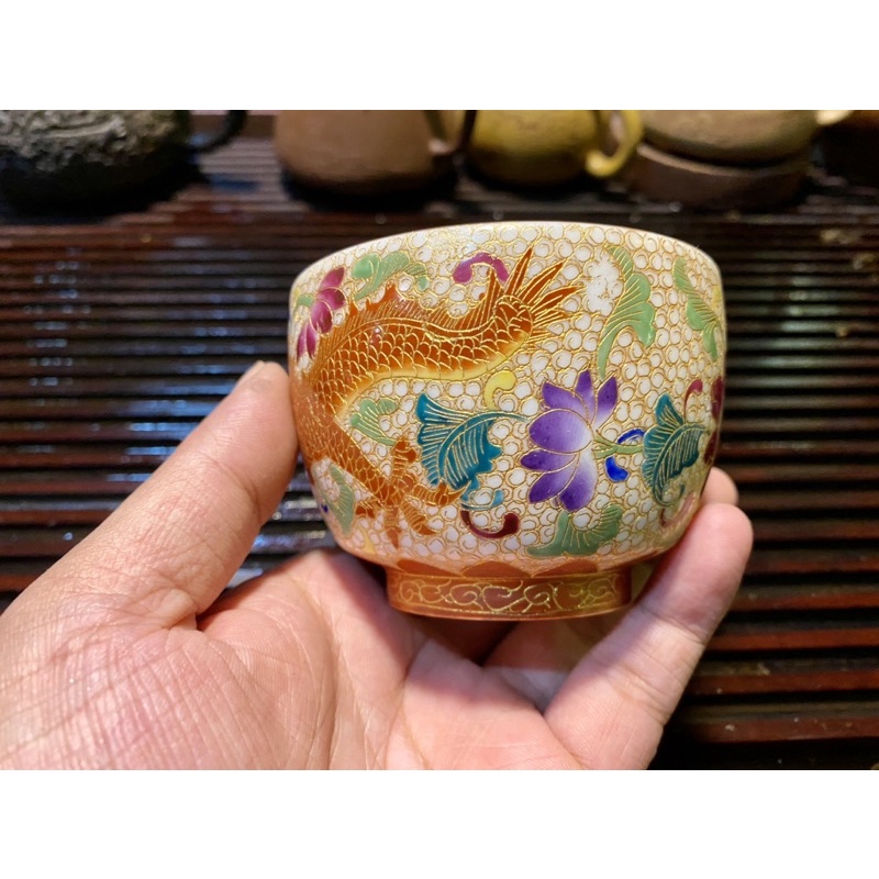 Hoạ Tiết Rồng Vẽ Thủ Công Chi Tiết Cao Cấp Pháp Lam,lòng chén tráng vàng 24 k đáng sưu tầm sử dụng làm chén chủ