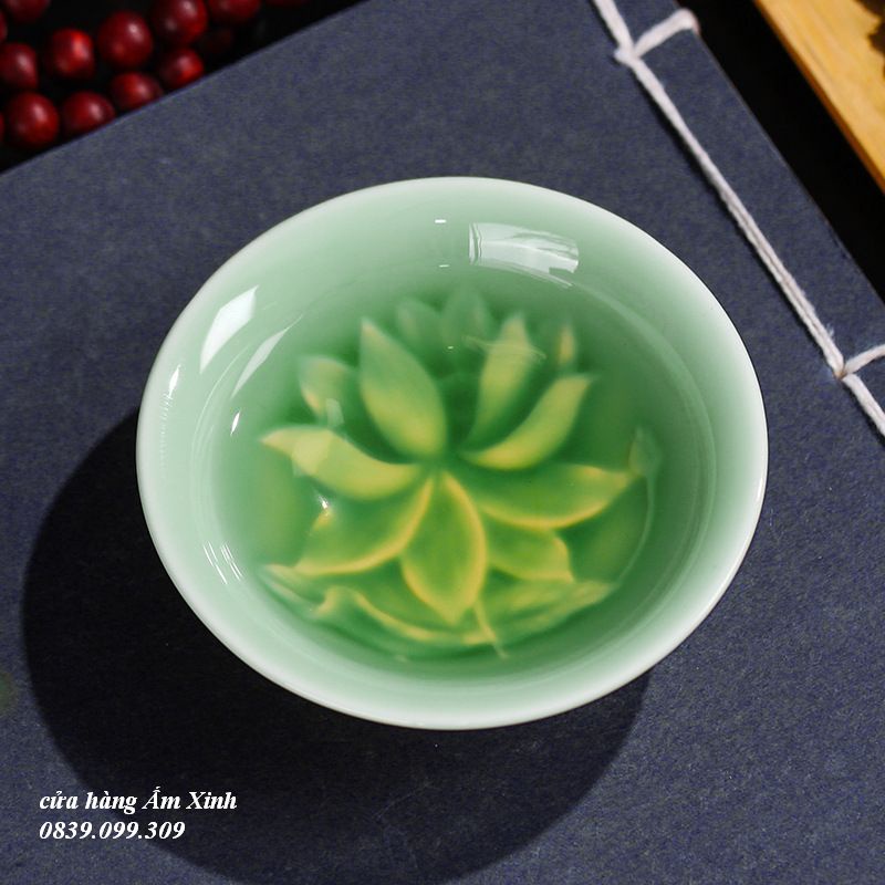 + Trong lòng chén: men xanh cùng với họa tiết vẽ tay vô cùng tinh sảo và sắc nét (tôn lên mầu trà rất đẹp mắt)