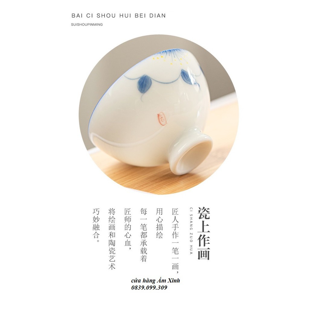 + Chất liệu: Sứ thanh hoa – sứ Cảnh Đức (sứ mỏng cao cấp, Độ tinh khiết rất cao anh sáng có thể lọt qua)