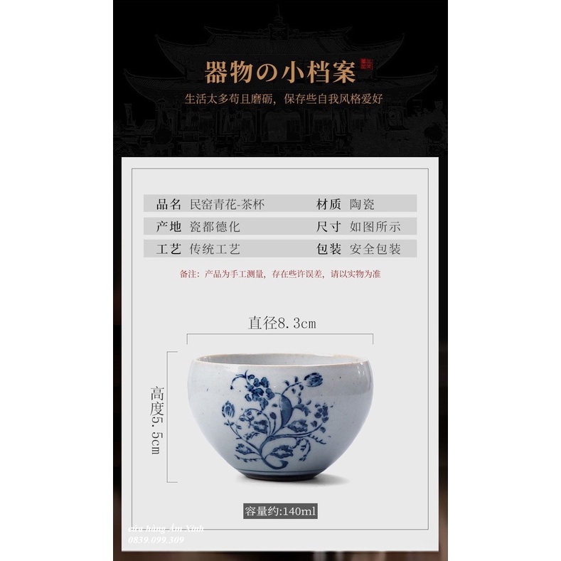 Giới thiệu Chén Sứ Cảnh Đức vẽ tay họa tiết men lam độc đáo 140 ml