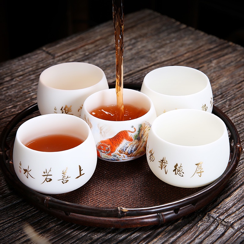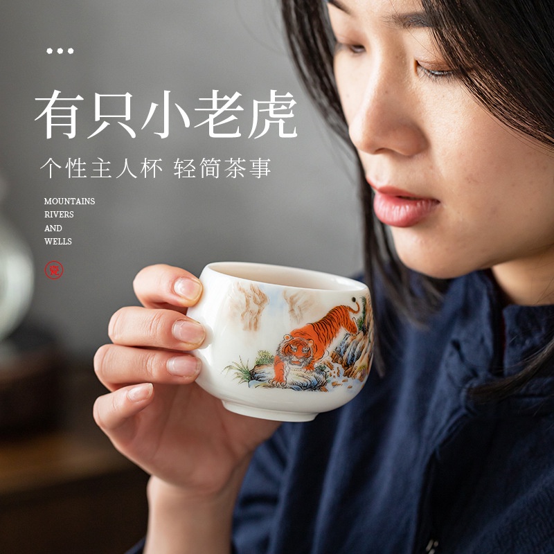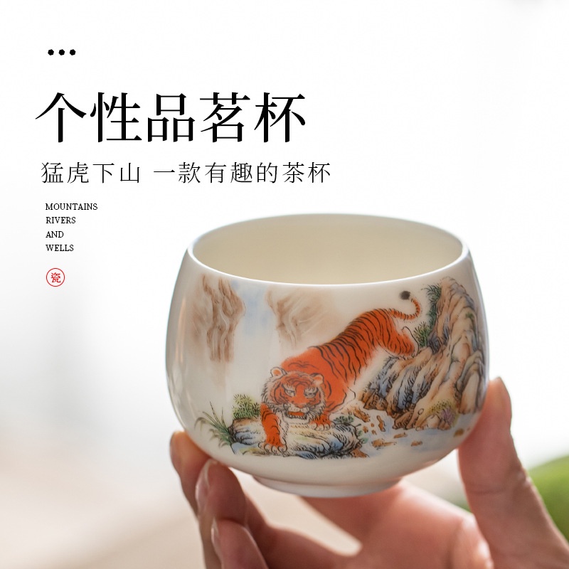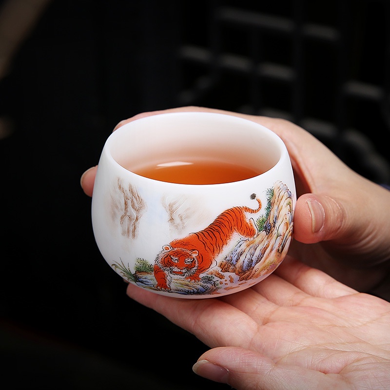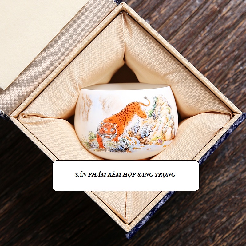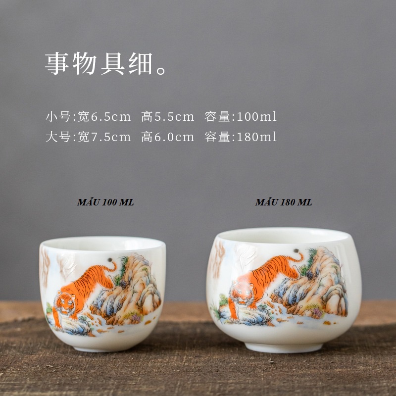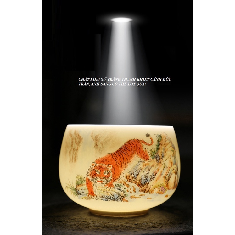 Chén Sứ Cảnh Đức Vẽ Tay Mãnh Hổ, sứ trắng thanh khiết thấu quang (Chén Chủ)