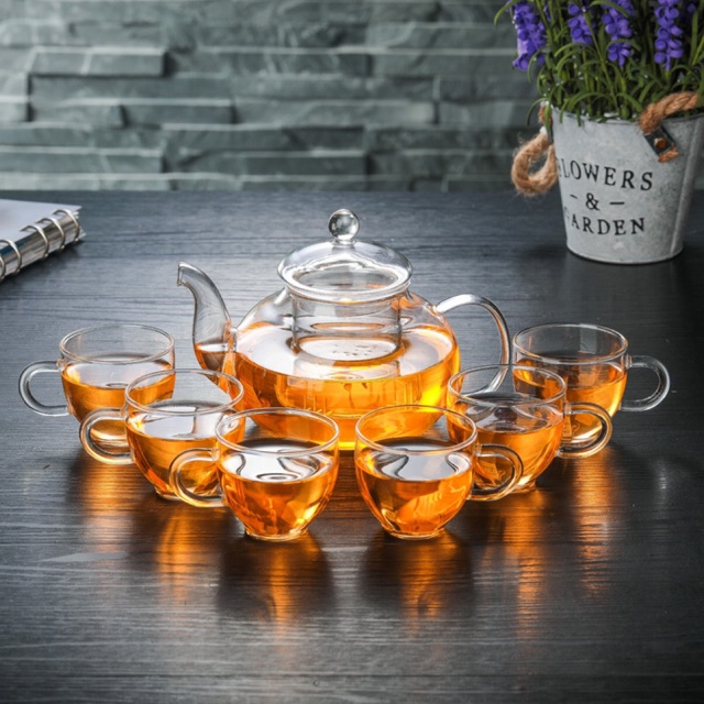 Bộ ấm chén thuỷ tinh 1 set bao gồm:1 ấm lọc thuỷ tinh chịu nhiệt 600ml ( đun được trên bếp hồng ngoại)