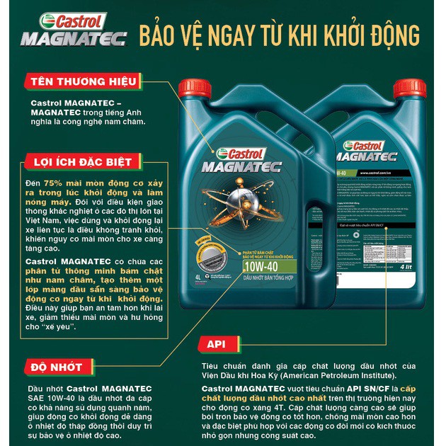- Castrol MAGNATEC 10W-40 thích hợp để sử dụng cho động cơ xăng, động cơ gas hoặc động cơ khi nén thiên nhiên yêu cầu loại dầu nhớt đáp ứng tiêu chuẩn API SN hoặc thấp hơn.