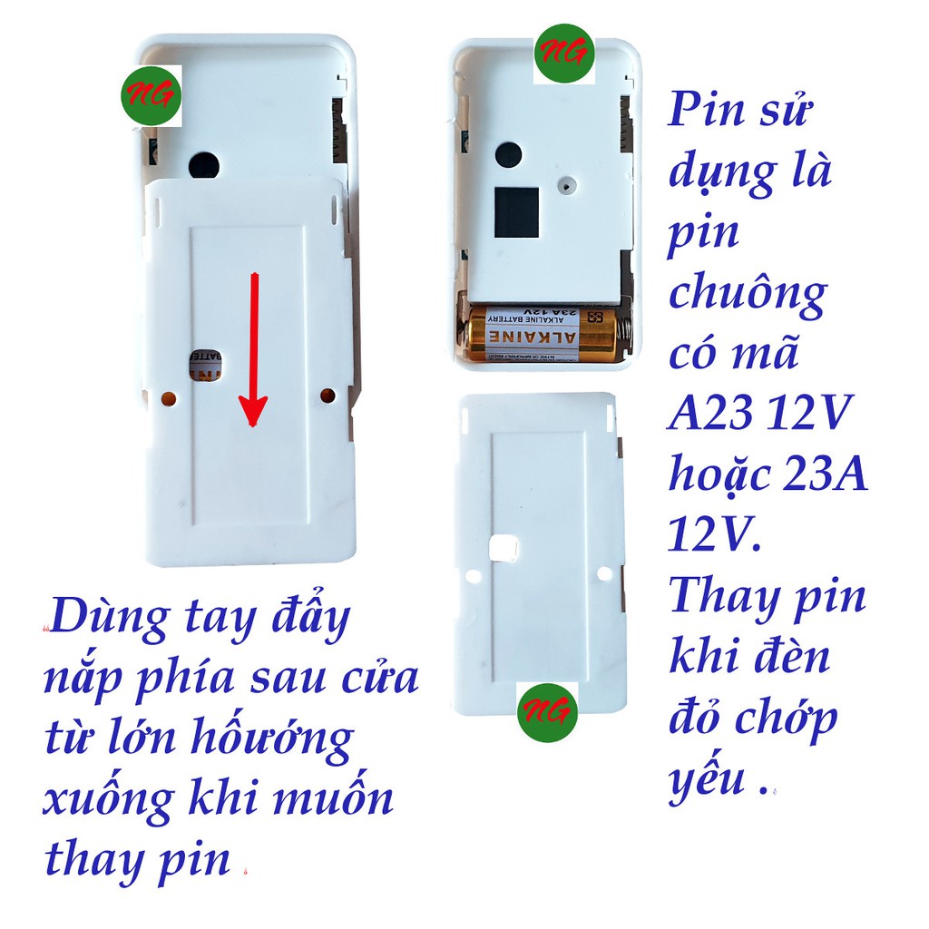 : 2 cửa từ để sát lại nhau và để gần chuông, cắm chuông vào ổ điện, dùng 2 ngón tay ấn cùng lúc nút trên và nút giữa cùng lúc nếu muốn dùng tiếng nhạc chuông ( nhấn nút giữa và nút dưới nếu muốn dùng tiếng báo động ) sao cho đèn ở giữa sáng màu xanh mà chuông không kêu là được. Sau đó mở cửa từ ra thì thấy đèn màu xanh trên chuông chớp 1 cái là đã nhận tín hiệu. dùng tay ấn vào nút giữa để tắt đèn màu xanh. Sau đó mở cửa từ trở lại để xem chuông ở kêu hay chưa.
