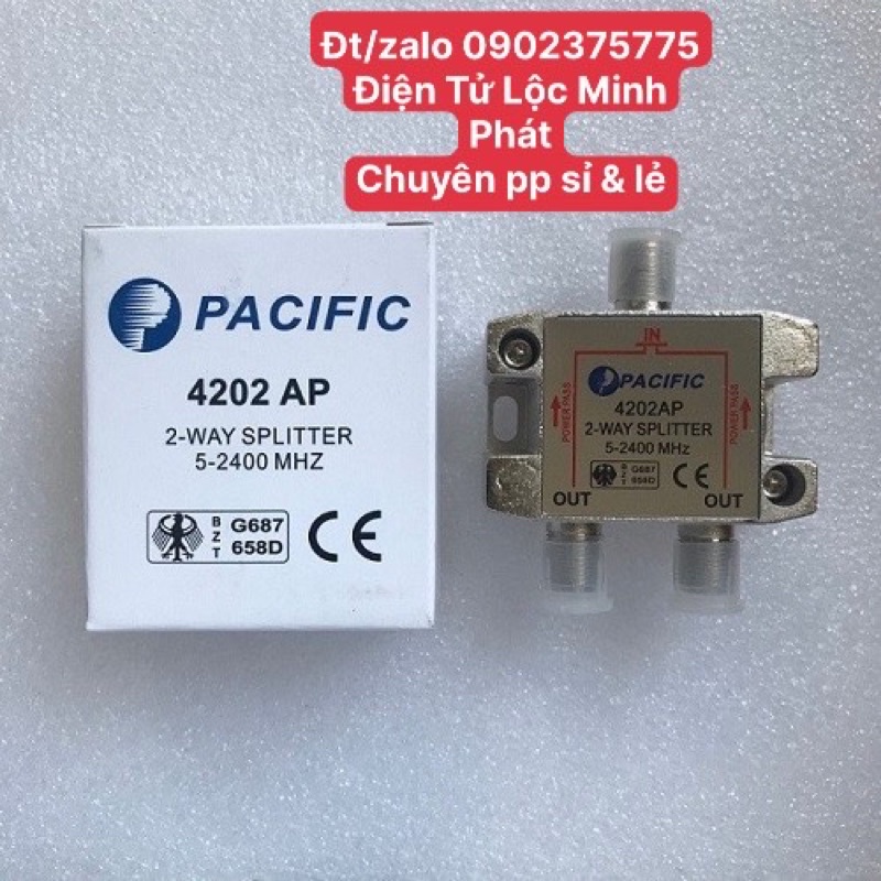 Tín hiệu chia ra đồng đều và suy hao thấp.Dải tần làm việc từ: 5 – 2400 Mhz.Bộ chia cao tần PACIFIC 4202AP có các loại 2,3,4,6,8 ngõ ra, dải tần làm việc từ: 5 – 2400 Mhz.