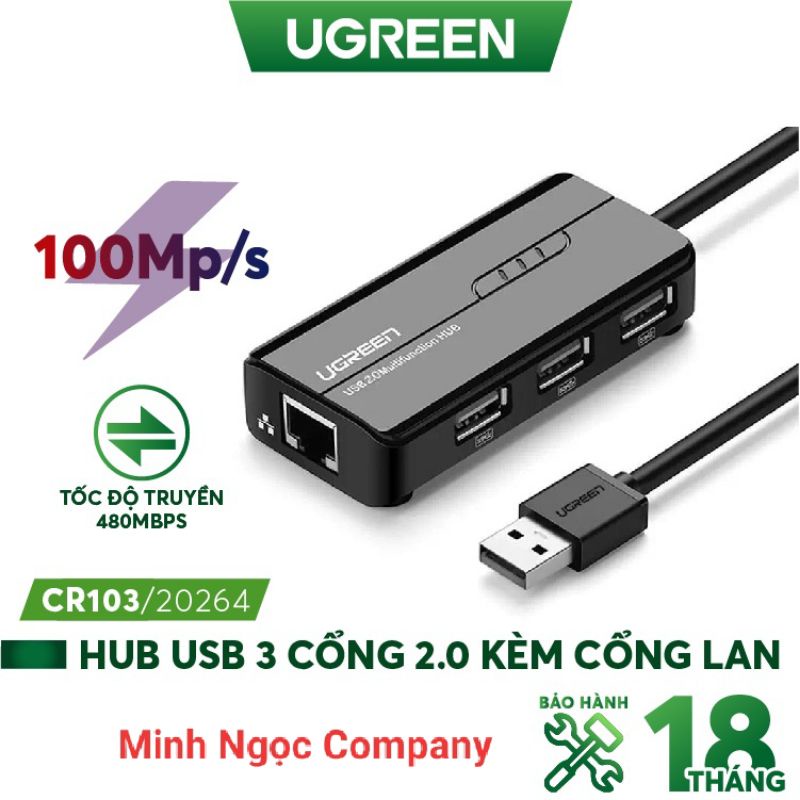 Bộ chia 3 cổng USB 2.0 kèm cổng mạng LAN 10/100/1000 Mbps cao cấp Ugreen 20264 CR103 - Hàng Chính Hãng