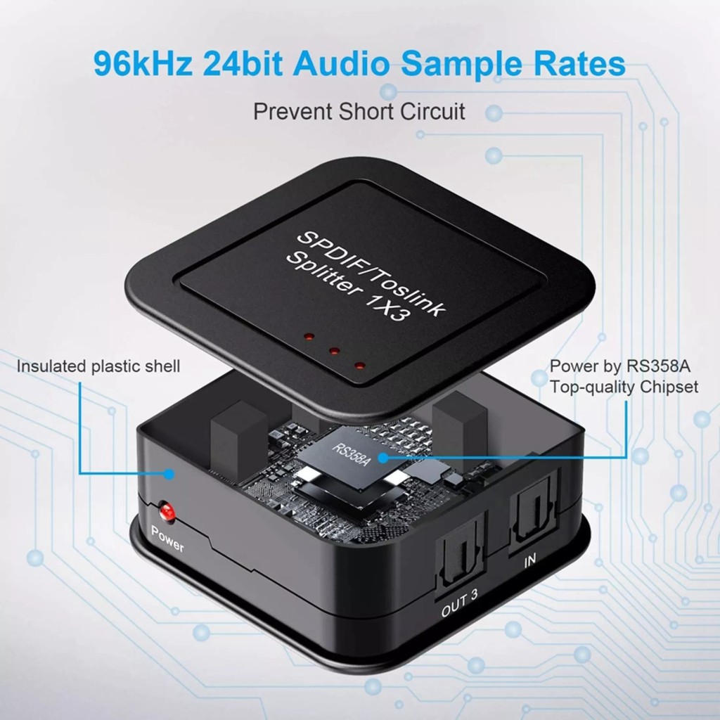 Lý tưởng cho việc kết nối nguồn âm thanh kỹ thuật số của bạn (PC, Apple TV, PS4, Xbox, đầu đĩa Blu-ray, hộp cáp, HDTV vv) và chia tách đến ba thiết bị đầu cuối (tai nghe, thanh âm thanh, bộ thu AV hoặc bộ khuếch đại).