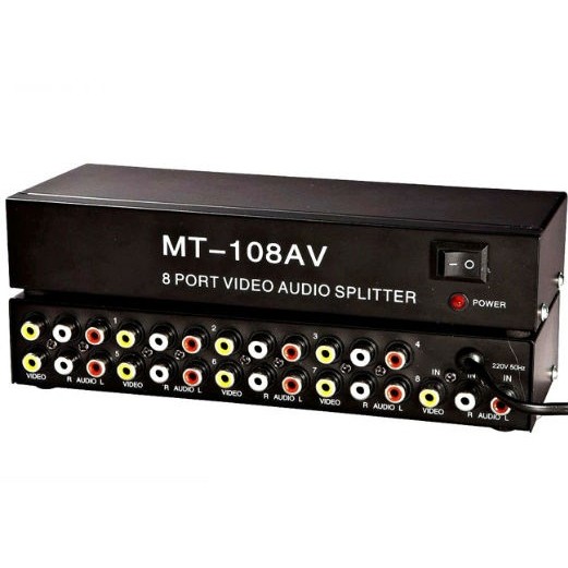 +> Bộ chia viki MT-108AV chính hãng với 3 tín hiệu vào là video(vàng), audio(trắng, đỏ) biếu hiện trái phải âm thanh.