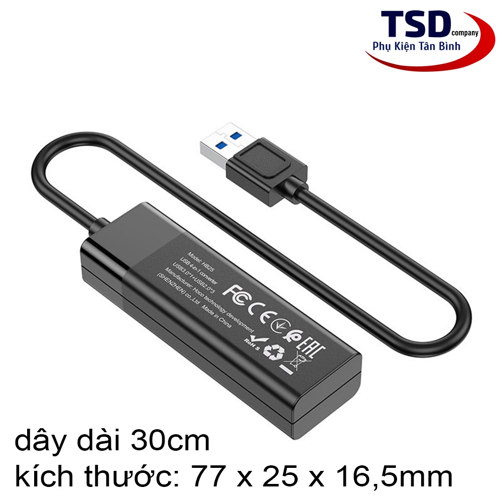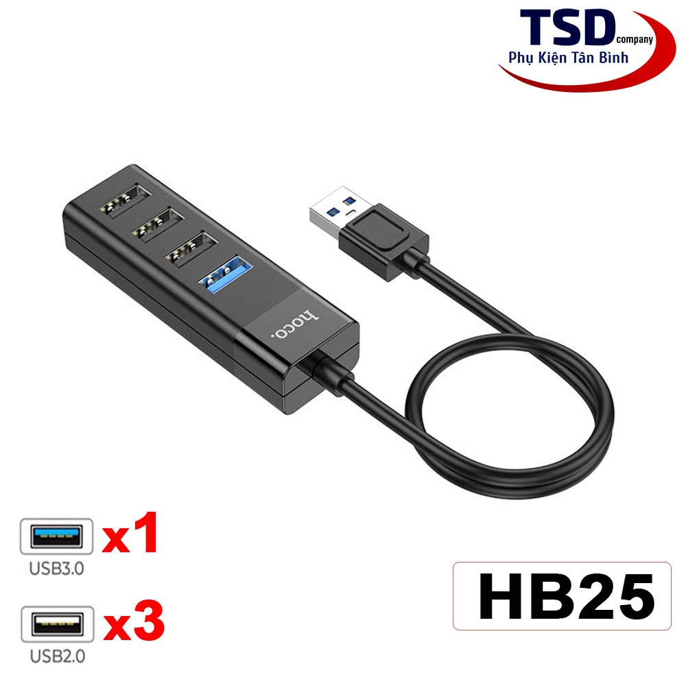 - Hub USB Hoco HB25 với 3 cổng USB 2.0, 1 cổng USB 3.0 và một đầu USB để kết nối với cổng USB trên máy tính.