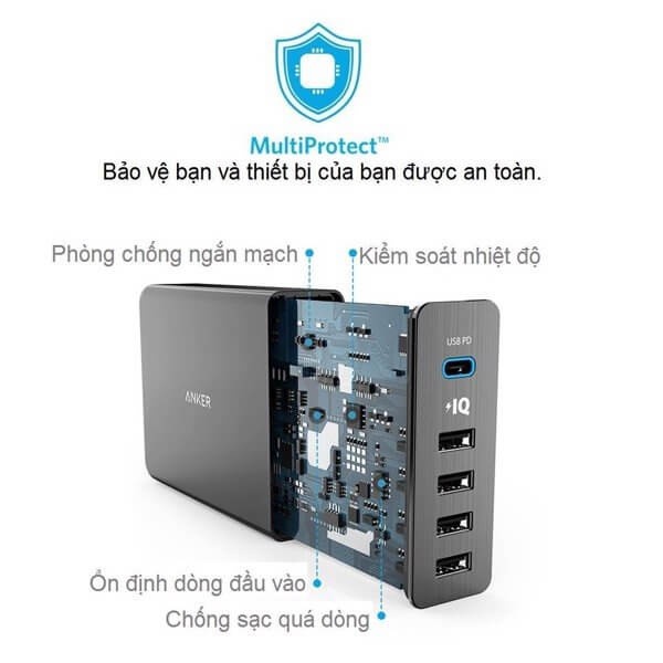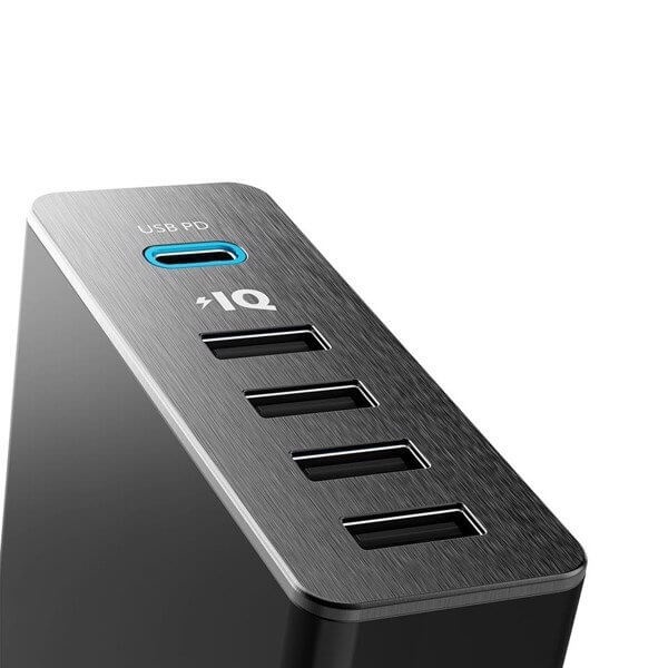 1 cổng USB-C và 4 cổng USB cho ra đồng thời 60w, đủ để sạc cùng lúc nhiều thiết bị (tối đa 5 thiết bị).